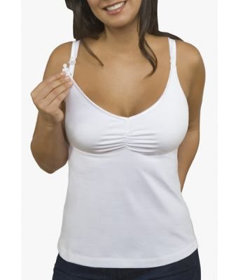 Bravado! Style 710FG. Nursing bra tank top. Soft stretch cotton. Built-in molded bra for support. CottonFlex lining for flexible comfort. Hip-length tank with slight flare retains shape. Convenient one-handed nursing clips. Pretty shirred detail at bustline. Cushioned, adjustable straps. Specifically designed for expectant and nursing mothers.